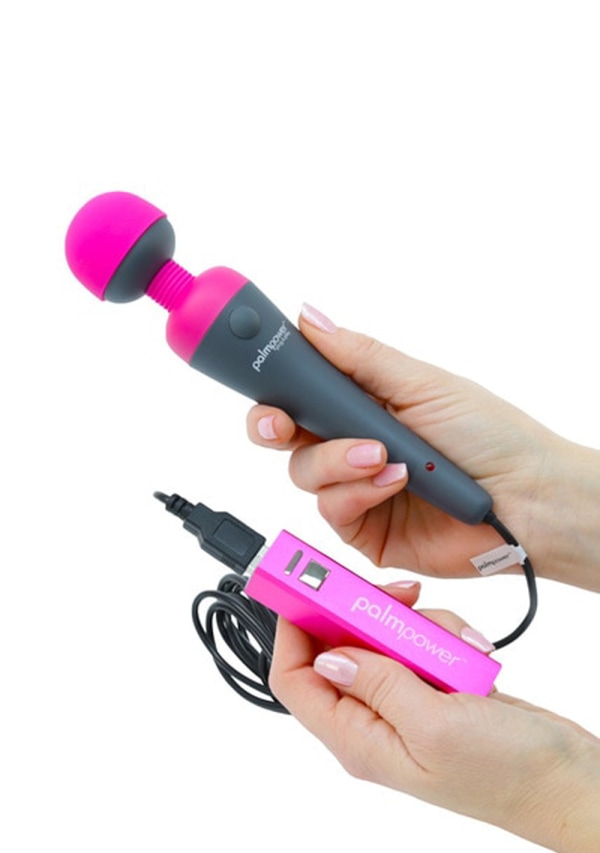 The PalmPower Plug and Play Variable Speed Wand Massager is USB powered and requires no batteries! Unlike the Original PalmPower, the PalmPower Plug and Play and its Incremental speed control for precise power can be powered anytime and anywhere through the portable power bank included with this pack. The PalmPower Plug and Play works with all current PalmPower attachments using the “T” lock guide to keep the attachments secure and in place during use. Easily pop the removable silicone head off and replace with any other PalmPower attachments for different sensations. To turn on your PalmPower Plug and Play Massager, simply press the One Touch Incremental Speed Control and away you go into orgasmic bliss. Press and hold the same button to increase the intensity of your favorite sex toy. The PalmPower Plug and Play has a grey handle with a vibrant fuchsia silicone cap and neck.