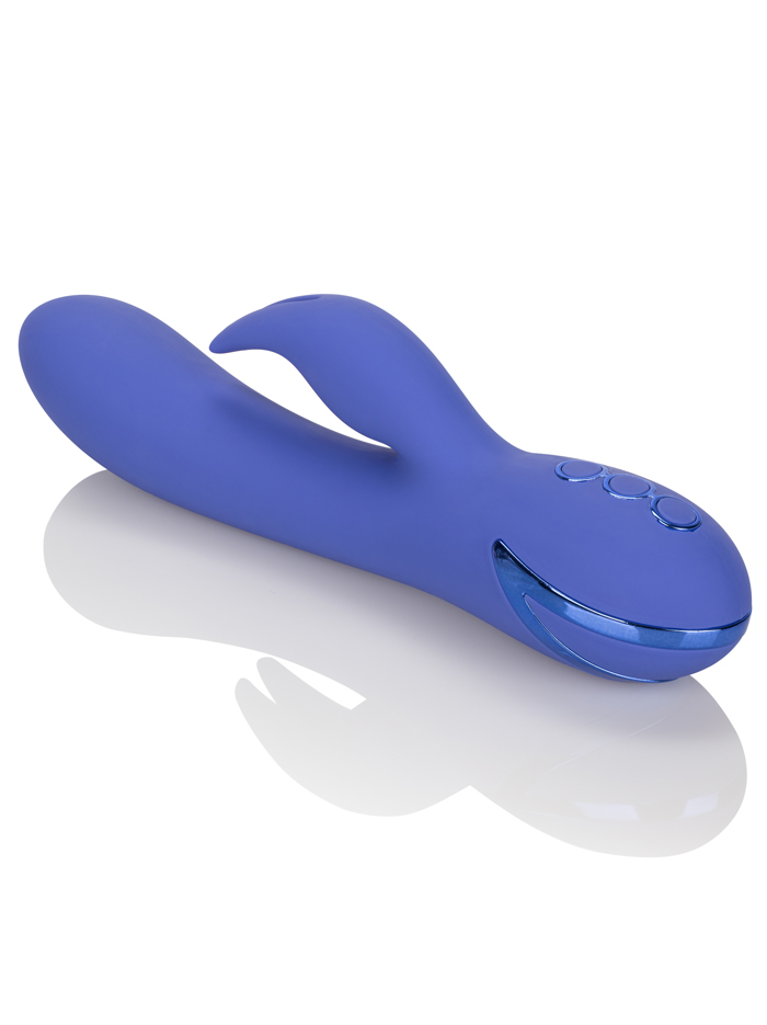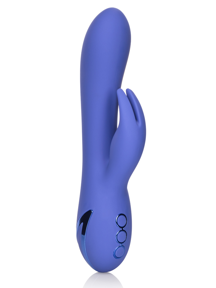 There’s a sleek new silicone bunny in town! This powerful twice-as-nice vibrator is shaped like a stylized rabbit and offers dual stimulation via its shapely shaft and its signature bunny ears, arced to provide more coverage–enjoy intense external stimulation plus the pleasure of internal rotating beads located in the shaft. Choose from three speeds for the beads and also explore the clitoral stimulator’s ten independent functions: vibration, escalation and pulsation, with multiple speeds for each. A memory chip resumes the last function used next time you reach for your bunny–once you find your favorite setting you don’t have to scroll through all the options next time you turn it on. One button unlocks the toy, while two others independently control the internal and external stimulators.