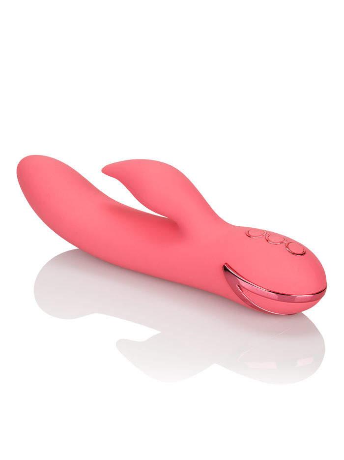 Ready for a pleasure ride? Enjoy double the fun with this waterproof twice-as-nice silicone vibrator. The San Francisco Sweetheart has both an internal and an external motor which can be independently controlled, giving you total control over your pleasure. You can even mix and match the various modes on either motor! Find a setting you like? The memory chip lets you quickly find your favorite so you can get right down to business! This varied toy has three buttons to press: one button moves the internal piece, the second button controls the external bit, and the third button can take the San Francisco Sweetheart off and on travel lock! The internal piece will rock you back and forth to orgasm with three levels of tantalizing come-hither motion, stimulating the G-spot in a whole new way! The pointed external stimulator flickers and teases your sensitive bits with ten different levels of vibration, escalation, AND pulsation; between the external stimulation and the rocking internal shaft, who wouldn’t want unlimited rides on this San Francisco Sweetheart!