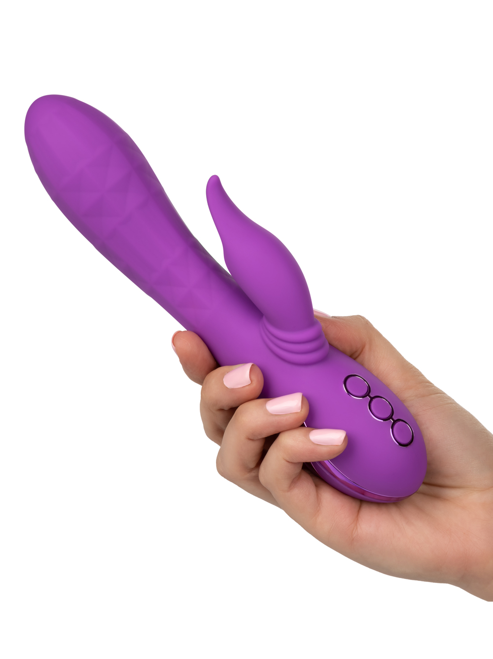 The Valley Vamp has both an internal and an external motor which can be independently controlled, giving you total control over your pleasure. You can even mix and match the various modes on either motor! Find a setting you like? The memory chip lets you quickly return to your favorite so you can get right back to business! This varied toy has three buttons to press: one button moves the internal piece, the second button controls the external bit, and the third button activates the Valley Vamp’s travel lock! The internal piece will pulsate you back and forth to orgasm with three levels of mesmerizing vibration, stimulating the G-spot in a whole new way! The external flickering teases your sensitive bits with ten different levels of vibration, escalation, AND pulsation that are sure to hit all the spots; between the external stimulation and the rotating internal shaft, the California sun will shine all day in your bedroom.