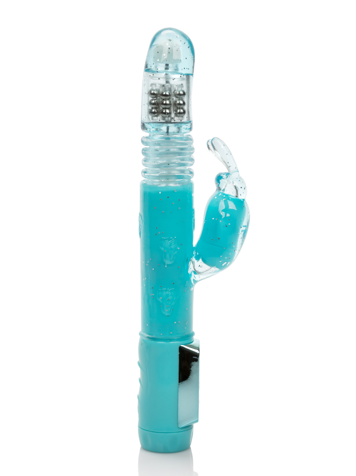 Now this is a real power bunny! The Dazzle Xtreme is a twice-as-nice thrusting vibrator with a slender shaft; three solid rows of fixed (non-jamming) rotating beads offer additional internal stimulation. While the attached bunny offers you a choice of 12 functions of flickering vibration, the shaft sports four patterns of synced rotating and thrusting. The pleasure combinations are practically endless! Push-button controls are located at the base, including an auto on/off button. The base unscrews and battery compartment slides out for easy loading of batteries (it takes three AAAs). Waterproof; care for the toy with mild soap and water.