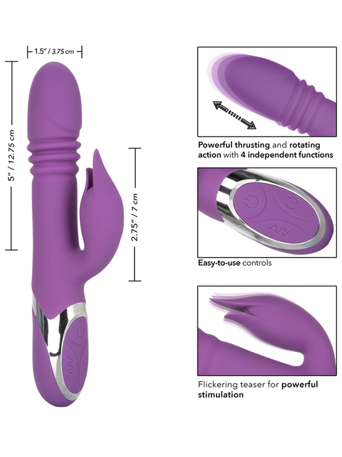 Kisser will enchant you with its powers–and its multi-tasking abilities, because this is a toy that does it all! This vibrating twice-as-nice-style thruster is styled with a lip-like external stimulator whose tip is perfect for those who love pinpoint sensation, while its broader side will spread out the pleasure. The external “bud” also offers you 12 independent vibrating levels, but that’s just the start. Choose your favorite of four separate strong thrusting modes, or advance through them all–thrusting action continues even when pressure is applied. With a bulbous tip for G-spot (or P spot) stimulation, plus ribs located at the center of the shaft that assist in the thrusting motion, but also provide an extra level of stimulation during penetration, this toy is ready to stimulate you every which way!