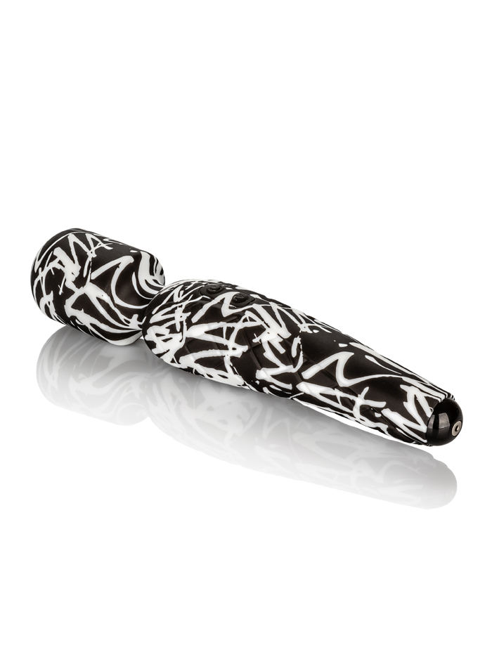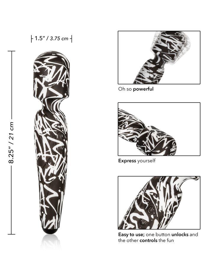 Inspired by graffiti art, accessibly priced, and styled for pleasure, this wand vibrator sports deep vibrations, and a smooth broad head for external stimulation. Covered with smooth silicone, offering a lush feel against the body, with a flexible neck that allows you to control the pressure you feel, so the vibrations are just the way you like them. Equipped with 10 vibration modes – three vibration settings with seven pulsations levels. Control your play experience with just two buttons; hold the power button down for three seconds to turn on or off, and use the lower button to scroll through all the modes. /p>