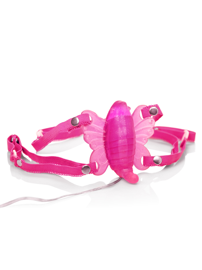 Fans of the wearable Venus Butterfly will love this bright-pink critter, here to offer hands-free external vibrator placement and many options for play. If you’re looking for hands-free stimulation that can stay in place during foreplay, penetration, and more, the Butterfly is designed with stretchy, elastic waist/thigh straps to keep it on the clitoris while the wings tease the labia. (Fits up to 22” diameter thighs and 32” diameter waist strap.) Depending on the wearer’s anatomy and size, the butterfly may be unobtrusive enough for intercourse or may cover the vaginal opening; the design is fun for masturbation, sexploration, and other sexy play. Experiment to find out which positions work best for you! Variable speed, powered by an easy-to-use wired controller with a multi-speed control dial; takes two AA batteries (not included). The vibrator is not waterproof; to clean, wipe with damp cloth or spray with toy cleaner.