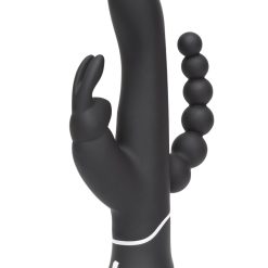 This happy rabbit wants to make you as happy as possible—it’s not just a twice-as-nice toy, it’s thrice-as-nice! Count on this seriously smart rabbit for three kinds of simultaneous stimulation: vaginal, clitoral and anal. The central shaft is sleek and smooth, with a slightly angled head for subtle g-spot stimulation. The rabbit-shaped external stimulator offers two flexible, fluttering ears as well as a protruding “nose” to really nestle into the clitoris. Tapered and angled stacked anal beads top off this sensation trifecta! Fans of intense stimulation will love the feeling of fullness and really thrilling combination of sensations this bawdy bunny can evoke.