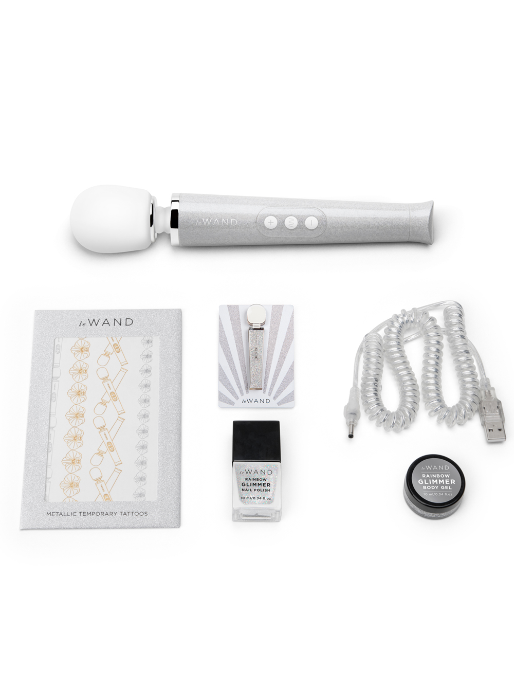 Ideal for beginners, the cordless Le Wand Petite’s lightweight and flexible design is great for stimulating all of your erogenous zones, including your neck, thighs, back or wherever your body is holding stress! Perfect for solo or couples play! Its rechargeable battery and travel-lock make it the perfect travel companion wherever your fantasies may lead. The All That Glimmers Special Edition Le Wand Petite set comes with a pleasure guide, a glittery travel case, a pin to show off your pleasure pride, a set of Rainbow Glimmer nail polish and body gel to make All That Glimmers, you! USB rechargeable; a two-hour charge yields one hour of use. Play confidently knowing that all Le Wand products come with a 1-year warranty and a lifetime guarantee. We recommend a water-based lubricant with this massager. Be sure to clean before and after every use.