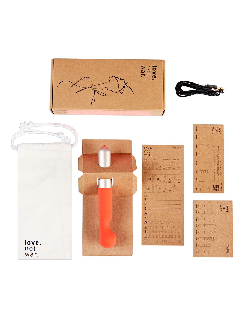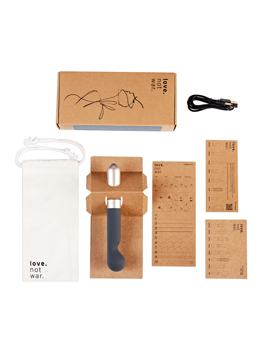 Love Not War is a new innovative line of sustainable and eco-friendly vibrators—the base of the vibe is made from recycled aluminum, which is one of the most sustainable metals (98% recycled worldwide.) The main part of the toy is made from silicone, which is more readily recyclable than plastic and plastic-derived materials. Even the storage bag that comes with the vibe is made from sustainable bamboo fabric. Love Not War vibes use very small amounts of plastic, and the company recycles that plastic within the factory.
