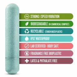 Love yourself and the planet with this smooth waterproof mini-bullet vibrator with an eco-friendly difference! Created from BioFeel, a starch-based bioplastic made of a polymer compound mixed with corn starch, it’s biodegradable in commercial compost and recyclable in select facilities. Making it uses less energy and creates fewer greenhouse gas emissions than traditional plastic, so you can feel good about feeling good! Designed for external stimulation with resonating lower-pitch vibrations in one stimulating speed, the slim, petite cylinder shape has rounded ends (not anal-safe). A one-touch button at the base turns the vibe on and off.
