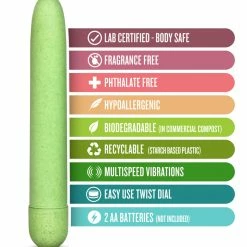 Here’s a versatile, smooth waterproof vibrator in a classic shape, with an eco-friendly difference! Created from BioFeel, a starch-based bioplastic made of a polymer compound mixed with corn starch, it’s biodegradable in commercial compost and recyclable in select facilities. Making it uses less energy and creates fewer greenhouse gas emissions than traditional plastic, so you can love yourself and the planet at the same time! Designed for both internal and external stimulation with resonating lower-pitch vibrations, the slim cylinder shape tapers toward the tip for ease of insertion (not anal-safe, though). A multi-speed dial at the base allows for variable vibration intensities. Battery-operated; requires two AA batteries (not included). 60-day warranty.