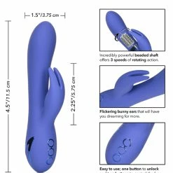 There’s a sleek new silicone bunny in town! This powerful twice-as-nice vibrator is shaped like a stylized rabbit and offers dual stimulation via its shapely shaft and its signature bunny ears, arced to provide more coverage–enjoy intense external stimulation plus the pleasure of internal rotating beads located in the shaft. Choose from three speeds for the beads and also explore the clitoral stimulator’s ten independent functions: vibration, escalation and pulsation, with multiple speeds for each. A memory chip resumes the last function used next time you reach for your bunny–once you find your favorite setting you don’t have to scroll through all the options next time you turn it on. One button unlocks the toy, while two others independently control the internal and external stimulators.
