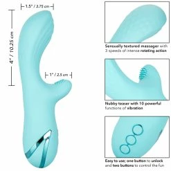 The Catalina Climaxer has both an internal and an external motor which can be independently controlled, giving you total control over your pleasure. You can even mix and match the various modes on either motor! Find a setting you like? The memory chip lets you quickly return to your favorite so you can get right back to business! This varied toy has three buttons to press: one button moves the internal piece, the second button controls the external bit, and the third button activates the Catalina Climaxer’s travel lock! The internal piece will rock you back and forth to orgasm with three levels of tantalizing clockwise/counter-clockwise rotations, stimulating the G-spot in a whole new way! The textured external stimulator teases your sensitive bits with ten different levels of vibration, escalation, AND pulsation that are sure to hit all the spots; between the external stimulation and the rotating internal shaft, who wouldn’t want an extended vacation to Catalina?