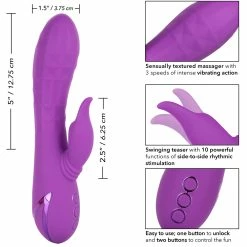 The Valley Vamp has both an internal and an external motor which can be independently controlled, giving you total control over your pleasure. You can even mix and match the various modes on either motor! Find a setting you like? The memory chip lets you quickly return to your favorite so you can get right back to business! This varied toy has three buttons to press: one button moves the internal piece, the second button controls the external bit, and the third button activates the Valley Vamp’s travel lock! The internal piece will pulsate you back and forth to orgasm with three levels of mesmerizing vibration, stimulating the G-spot in a whole new way! The external flickering teases your sensitive bits with ten different levels of vibration, escalation, AND pulsation that are sure to hit all the spots; between the external stimulation and the rotating internal shaft, the California sun will shine all day in your bedroom.