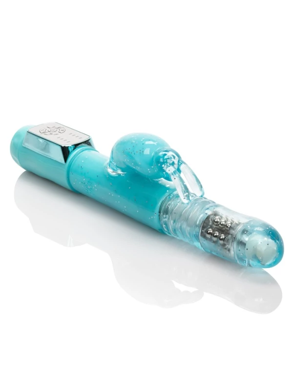 Now this is a real power bunny! The Dazzle Xtreme is a twice-as-nice thrusting vibrator with a slender shaft; three solid rows of fixed (non-jamming) rotating beads offer additional internal stimulation. While the attached bunny offers you a choice of 12 functions of flickering vibration, the shaft sports four patterns of synced rotating and thrusting. The pleasure combinations are practically endless! Push-button controls are located at the base, including an auto on/off button. The base unscrews and battery compartment slides out for easy loading of batteries (it takes three AAAs). Waterproof; care for the toy with mild soap and water.