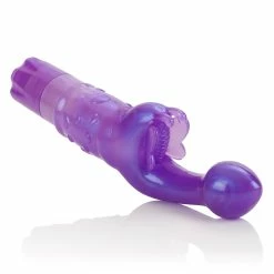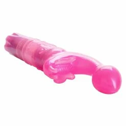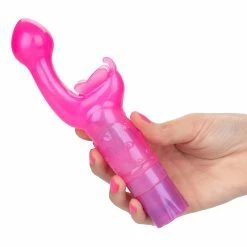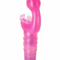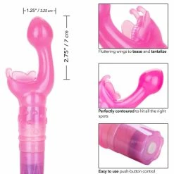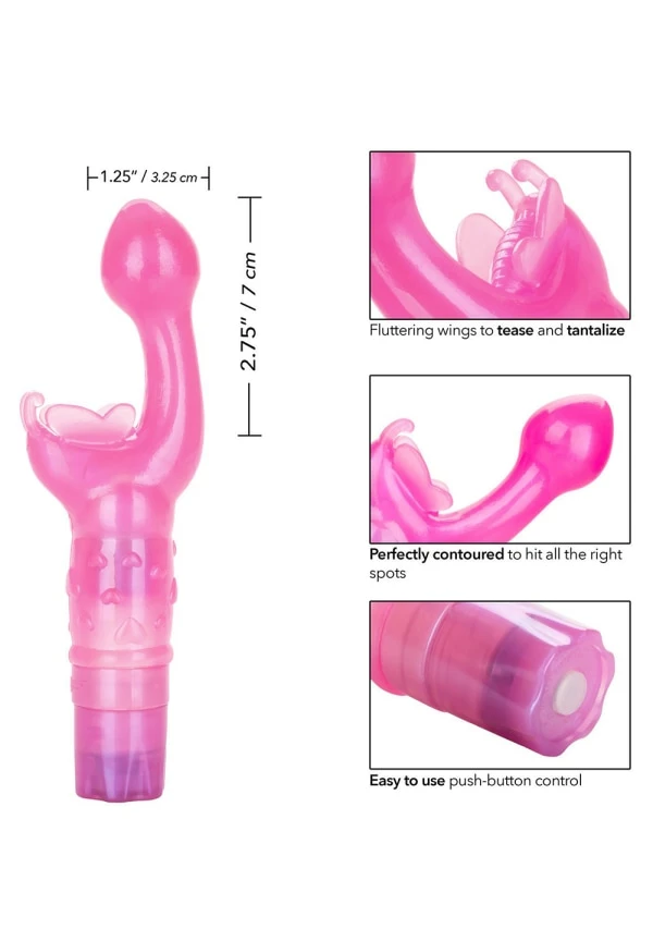 The curvy, hot pink massager has a decorated shaft, a smooth, angled bud shaped G-spot tip and a butterfly stimulation curve. The butterfly delivers intensely pleasurable fluttering antennae action, to massage and stimulate the clitoris. To use the tantalizing teaser, insert 2 AAA batteries into the end cap, and push the button control to activate the intense 3-speed ascending vibrations. The waterproof arouser measures a compact 2.75″ x 1.25″ (7 cm x 3.25 cm) and is ideal for slipping into your purse for intimate fun on the move. The feminine arouser is suitable for first time or experienced users. Use it for solo play in the shower, bath or hot tub, to experience an orgasmic time.