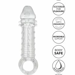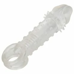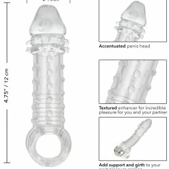 Amplify your pleasure with the Ultimate Extender penis enhancer. While the ribbed internal chamber stimulates the wearer, the added girth, studded texture and 2 inches of additional length amplifier pleasure for those being penetrated. The strap and thick sleeve provide additional erectile support, while being flexible enough to move in all the ways it’s needed. The soft, stretchy elastomer is unscented, phthalate free and easy to maintain. Simply wash with soap and warm water before and after each use.