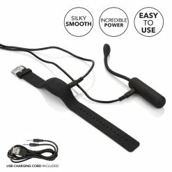 Play on the go, solo or partnered, with this petite bullet vibrator featuring a discreet wristband remote control. The smooth, slender, long-shaped bullet has a retrieval cord–useful if you like to use it vaginally, and it doubles as the antenna for the remote! The wristband controller lets you have both hands free for play without worrying where the remote went. With adjustable buckled closure, you (or your partner) can wear it like a watch; bring your play out into public (it offers a 32-foot radius range for play), or just appreciate the ease of use in your bedroom at home. With two-button controls and 12 functions of vibration, escalation and pulsation, use it with or without the remote; wear it inside underwear or inserted. Featuring a memory chip that resumes on the last function you used. Waterproof and equipped with a travel lock, the toy is USB rechargeable.