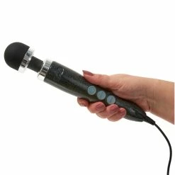 Gorgeous glitter on a field of black aluminum/titanium alloy blings up Doxy’s super-powerful, petite plug-in wand vibrator–this version is smaller and more lightweight than others in the Doxy line. Use this beautiful and versatile vibe to explore intense external stimulation and take massage and solo or partnered erotic play to new heights. Featuring deep, rumbling vibrations that go from 3000 rpm to 9000 rpm, Doxy’s three intensity levels are easily controlled by large + – buttons, with an independent button to turn the vibrator on or off. For additional escalating pulse settings, press and hold down the power button for three seconds. Featuring a non-porous rounded silicone head that offers a cushioned feel as it conducts Doxy’s powerful vibrations. Remove the rounded head for cleaning–just unscrew it! We recommend you use with water-based lubricants only; just wipe down the aluminum/titanium alloy body with a damp cloth to clean. Made in the UK, and ready to glitter in every port of call–Doxy comes with a plug-top power supply unit, so it’s easy to use with a travel plug adapter; UK, EU, US and AU/NZ are included.
