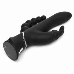 This happy rabbit wants to make you as happy as possible—it’s not just a twice-as-nice toy, it’s thrice-as-nice! Count on this seriously smart rabbit for three kinds of simultaneous stimulation: vaginal, clitoral and anal. The central shaft is sleek and smooth, with a slightly angled head for subtle g-spot stimulation. The rabbit-shaped external stimulator offers two flexible, fluttering ears as well as a protruding “nose” to really nestle into the clitoris. Tapered and angled stacked anal beads top off this sensation trifecta! Fans of intense stimulation will love the feeling of fullness and really thrilling combination of sensations this bawdy bunny can evoke.