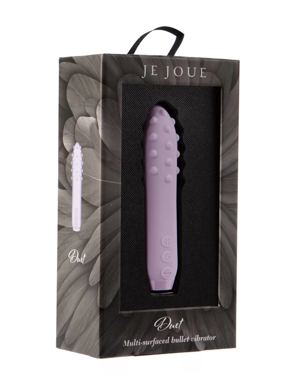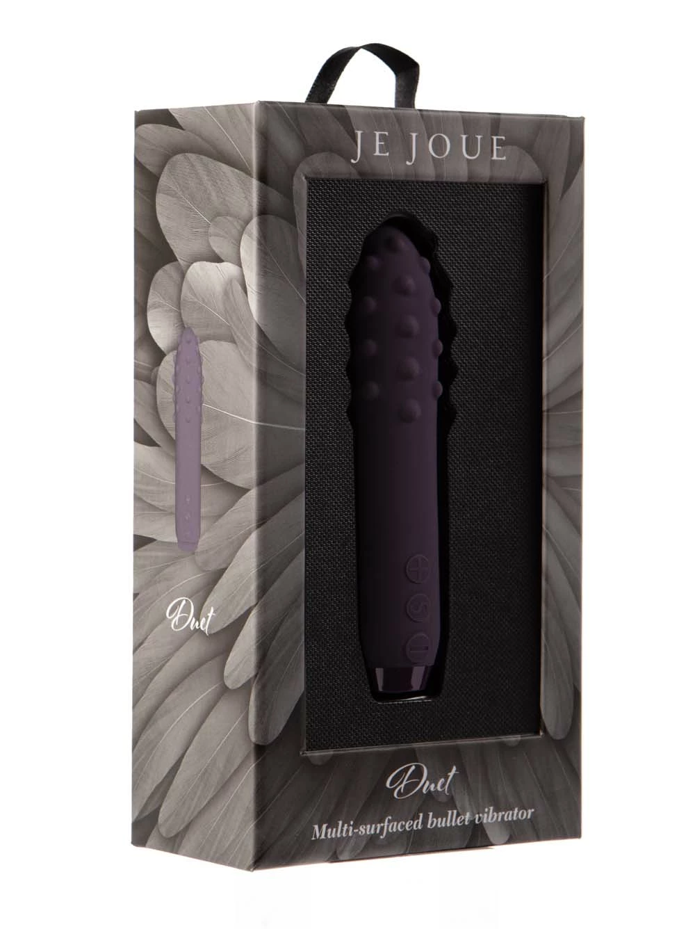 Meet Duet, a multi-surfaced bullet vibrator with small, rounded points and a smooth side to give multi-sensations across the body. Use Duet to stimulate external pleasure points such as the clitoris and nipples and if you want to explore further you can insert inside the body and enjoy shallow internal vibrations. Duet can do both. With silky soft, body-safe medical-grade silicone, Duet feels great to touch. Let Je Joue’s famous rumbly motors penetrate your body more deeply, giving you a richer sensation. USB rechargeable and waterproof. We recommend using a water-based lubricant with this silicone toy.