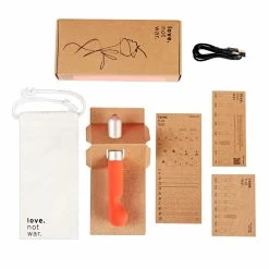 Love Not War is a new innovative line of sustainable and eco-friendly vibrators—the base of the vibe is made from recycled aluminum, which is one of the most sustainable metals (98% recycled worldwide.) The main part of the toy is made from silicone, which is more readily recyclable than plastic and plastic-derived materials. Even the storage bag that comes with the vibe is made from sustainable bamboo fabric. Love Not War vibes use very small amounts of plastic, and the company recycles that plastic within the factory.