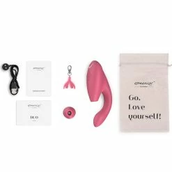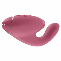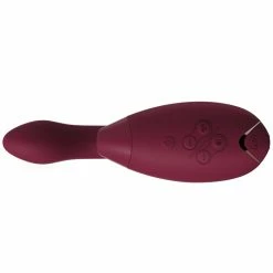 Womanizer Duo is a dual-mode, two-motor twice-as-nice stimulator that combines its innovative PleasureAir technology for external sensation with internal G-spot stimulation via a slim, flexible curved internal vibrator. PleasureAir creates a feeling of suction, from soft to superpowered–explore 12 different intensity levels–while the attached vibe offers you multiple levels of experience, with 12 vibration levels and 10 vibration modes (varying vibrations and patterns), plus a standby mode. Customize it for your preferred experience with the six-button control panel at the front of the super-soft silicone, waterproof toy. Duo is equipped with a Smart Silence sensor: PleasureAir turns on when Duo is close to your body, then turns off when you pull the toy away. It’s ready to start exactly when you want it to! USB rechargeable; an LED light in Duo’s stimulator head indicates by flashing when it’s charging; the light stops flashing when Duo is fully charged. You’ll also receive an additional larger stimulation head in the same color as the Duo you purchased, plus a quality branded storage bag so you can stash your toy with flair.