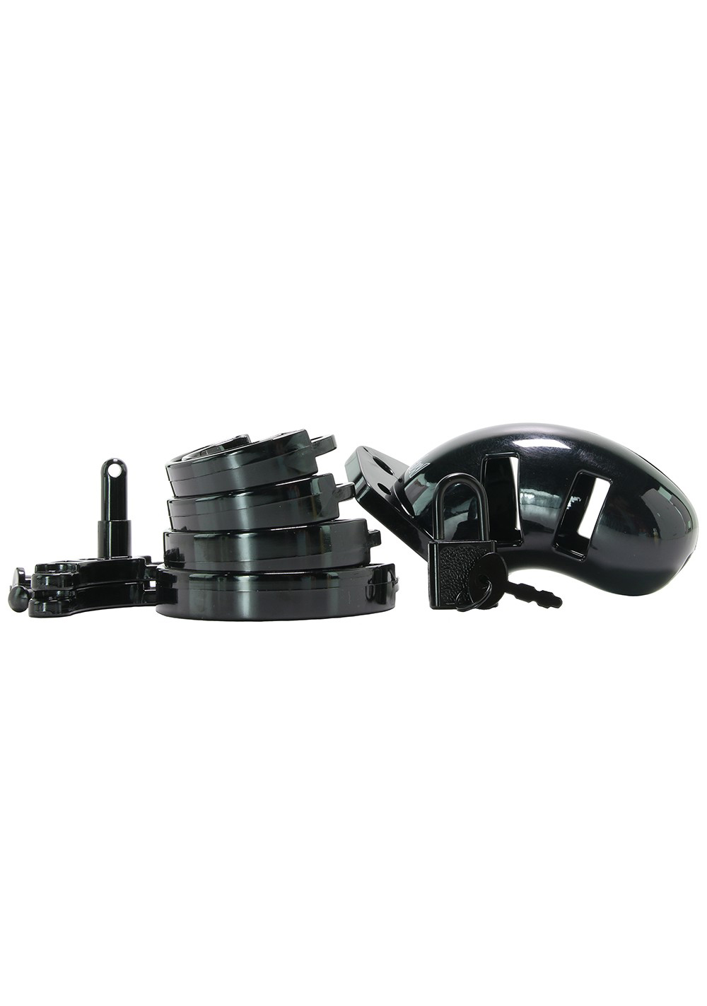 Take your BDSM play to the next level! To control or be controlled? That is the question! The Penis Cage Chastity Cages are manufactured from high-grade polycarbonate, a very light, durable, and hypoallergenic material. The cage consists of three parts that fit perfectly together. The two guidance pins connect the top parts and the oval taper pin connects the rings with the cage. A variety of rings in different sizes and distance pieces will allow you to create the perfect size! The rings have a comfortable fit and are absolutely safe. A metal lock or tie-wrap lock can easily close the cage. The included tie-wrap locks ensure that they will not trigger the alarm of metal detectors at parties, festivals, or even airports! As hygiene is very important while wearing a cage, the superior Penis Cage series is equipped with various vents and a urination opening. The cage makes it impossible to get an erection but it will be, after liberation, super intense, just like the freeing orgasm to follow! The Penis Cage Chastity Cage gives the keyholder optimal power over sexual gratification!
