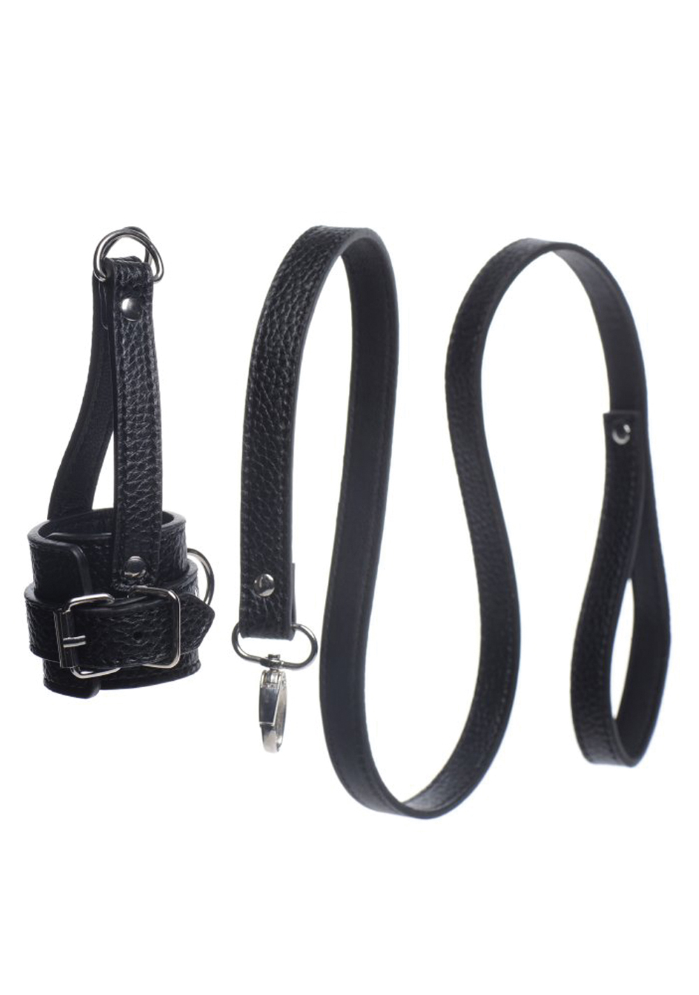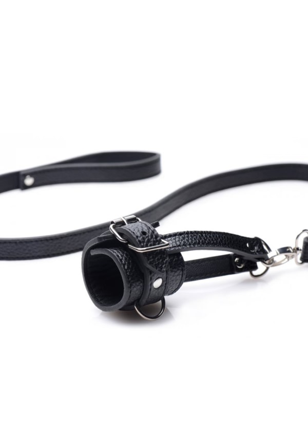 Take your pet for a walk with this humiliating ball-stretcher and leash set! The adjustable stretcher will wrap around his scrotum and tug down, creating a unique sensation that will keep him on edge! Attach the leash to the D-ring on the front or on the straps at the bottom, to pull your plaything around by his balls! You can also use the D-rings to connect weights so that your slave is further tormented.